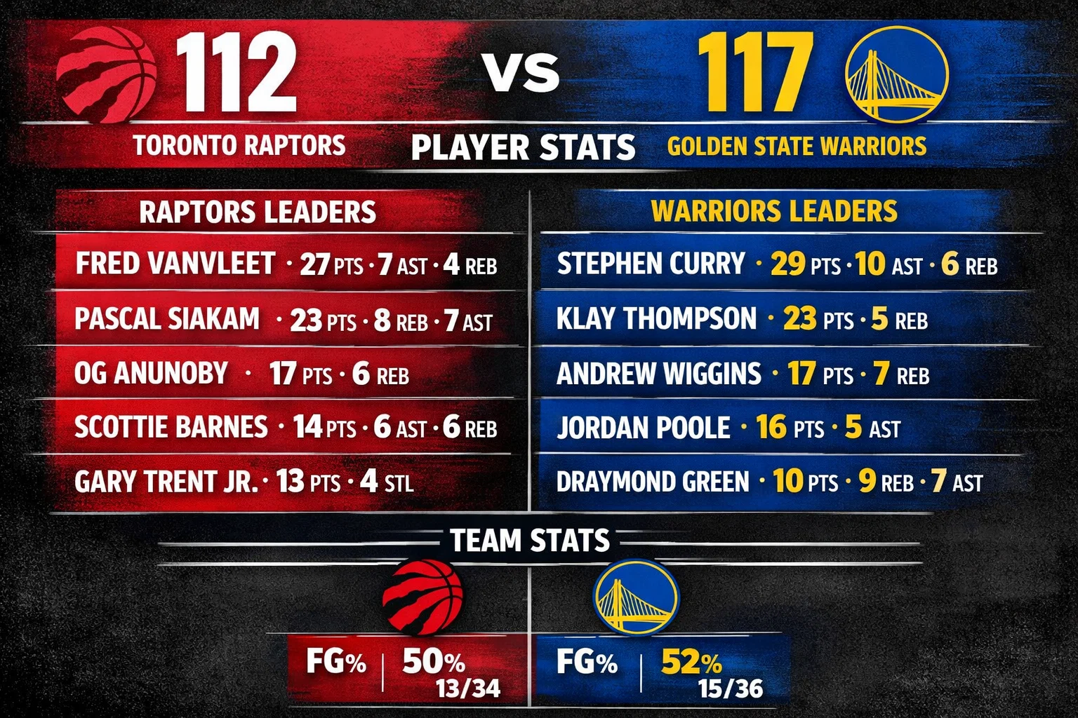 The latest clash between the Toronto Raptors and the Golden State Warriors lived up to the hype. While the toronto raptors vs golden state warriors match player stats show incredible individual scoring from Stephen Curry, basketball is a team game. The Raptors proved that effort on defense and on the glass can overcome even the best shooting performances.